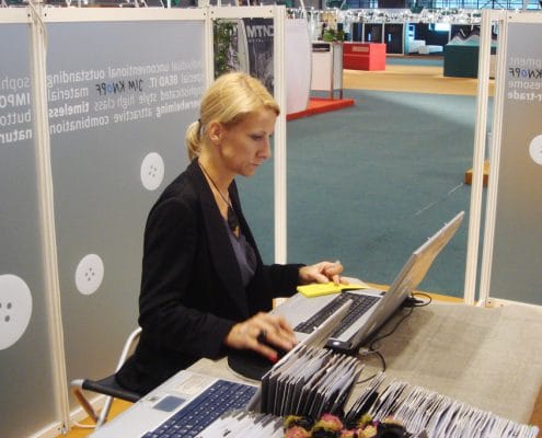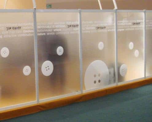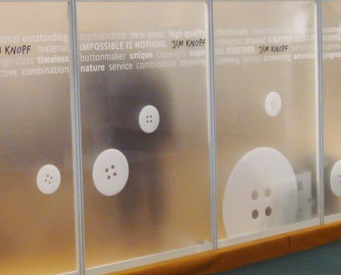 Die Firma »Jim Knopf« ist auf das Design und die Produktion von ausgefallenen Knöpfen aus natürlichen Materialien spezialisiert und beauftragte uns, einen dekorativen und informativen Sichtschutz für die dreizehn Elemente des Messestandes zu gestalten.